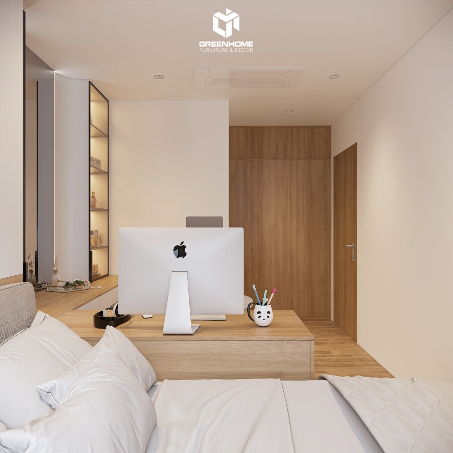 Không gian phòng ngủ master tại dự án thi công nội thất trọn gói Vũng Tàu Centre Point được thiết kế tối ưu với gam màu sáng chủ đạo, mang lại cảm giác rộng rãi và thư giãn. Giường ngủ được đặt trên bục gỗ cao, kết hợp hài hòa với bàn làm việc thông minh liền kề, vừa tiện dụng vừa tạo điểm nhấn hiện đại cho căn phòng.
