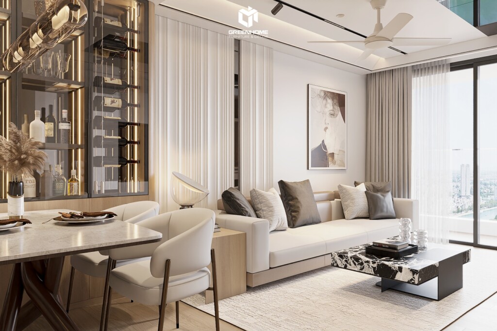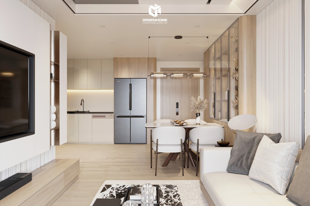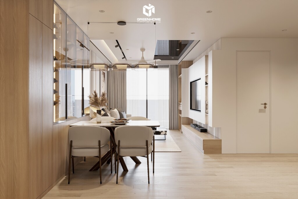Từ khu vực phòng ăn, có thể nhìn xuyên suốt ra phòng khách với thiết kế tối giản, các đường nét nội thất vuông vức, kết hợp màu sắc trung tính chủ đạo như trắng, kem, xám nhạt và màu gỗ tự nhiên, đem lại sự liên kết hài hòa giữa các khu vực chức năng. Thiết kế và thi công nội thất trọn gói tại Vũng Tàu Centre Point trong dự án này không chỉ chú trọng vào công năng sử dụng mà còn đề cao tính thẩm mỹ. Mang đến một không gian sống tiện nghi, hiện đại nhưng vẫn rất gần gũi.