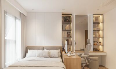Tại dự án thi công nội thất trọn gói Vũng Tàu Centre Point, phòng ngủ master gây ấn tượng mạnh với hệ tủ âm tường tinh tế, kệ trang trí tích hợp đèn LED và khu vực bàn trang điểm sang trọng. Sự bố trí hợp lý giữa các khu vực sinh hoạt giúp tối ưu công năng, đồng thời tôn lên vẻ đẹp thanh lịch và hiện đại của toàn bộ không gian.