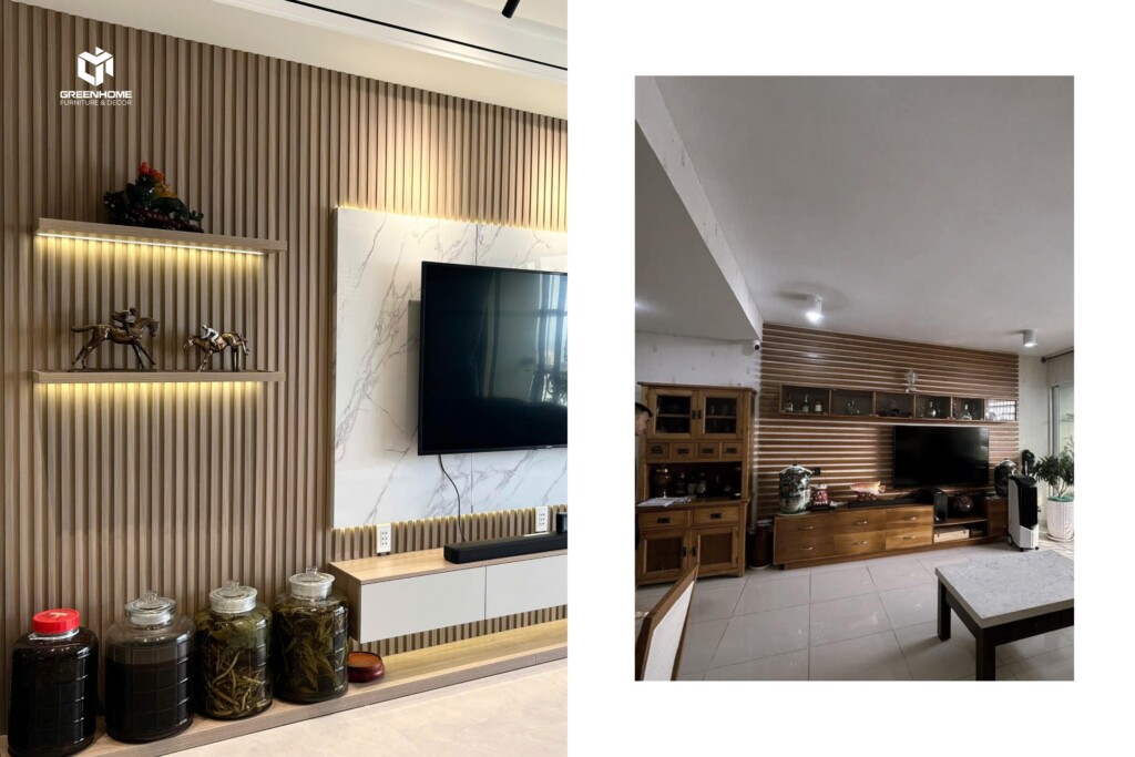 Phòng khách sang trọng: Thi công vách TV kết hợp hệ tủ trưng bày, vừa thẩm mỹ vừa tiện ích.