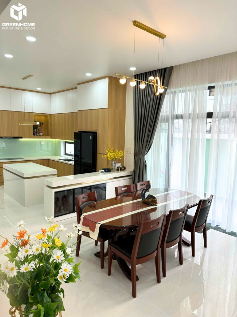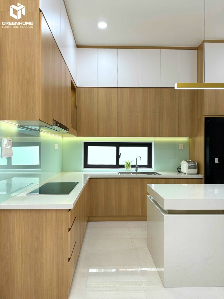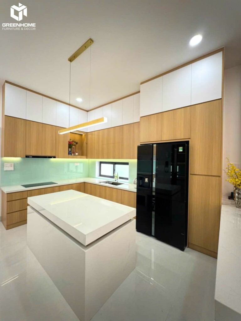 Gia đình khá đông thành viên nên nhu cầu sử dụng bếp cũng cần phải đầy đủ tiện nghi và rộng rãi. Với thiết kế hiện đại, KTS của chúng tôi đã chọn lựa những giải pháp tối ưu để làm hài lòng khách hàng. Một trong những ý tưởng được triển khai là tận dụng ánh sáng tự nhiên và không gian mở giữa bếp và phòng khách. Điều này tạo điều kiện cho sự thông thoáng và tạo điều kiện thuận lợi cho giao tiếp giữa các thành viên trong gia đình khi chuẩn bị và thưởng thức bữa ăn.