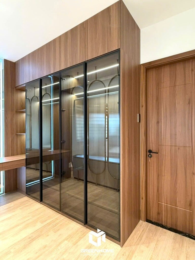 Không gian thay đồ và bàn trang điểm mang phong cách hiện đại, tinh tế. Toàn bộ hệ tủ được ốp gỗ vân nâu đồng bộ, kết hợp cánh kính đen sang trọng, tạo hiệu ứng mở rộng không gian và tăng chiều sâu thị giác.
