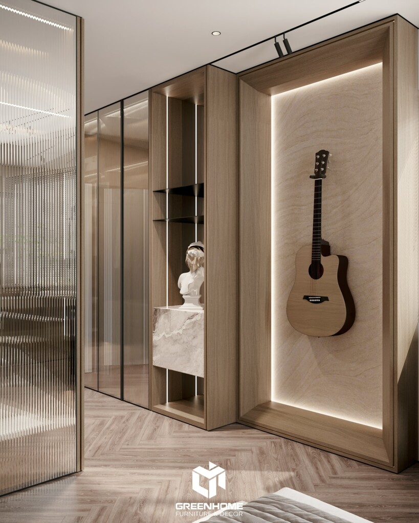 Góc làm việc được thiết kế theo phong cách hiện đại, tối giản nhưng vẫn đầy đủ tiện nghi. Ánh sáng tự nhiên tràn ngập qua ô cửa sổ lớn, kết hợp cùng gam màu trung tính tạo nên không gian làm việc lý tưởng, thư giãn. Chiếc ghế công thái học giúp tăng sự thoải mái, trong khi guitar treo tường lại mang đến điểm nhấn nghệ thuật cá tính. Đối diện đó, không gian tủ đồ được bố trí âm tường với hệ cửa kính sọc mờ sang trọng, vừa đảm bảo sự riêng tư vừa tạo cảm giác rộng thoáng. Từng chi tiết đều thể hiện gu thẩm mỹ tinh tế và đẳng cấp của gia chủ.