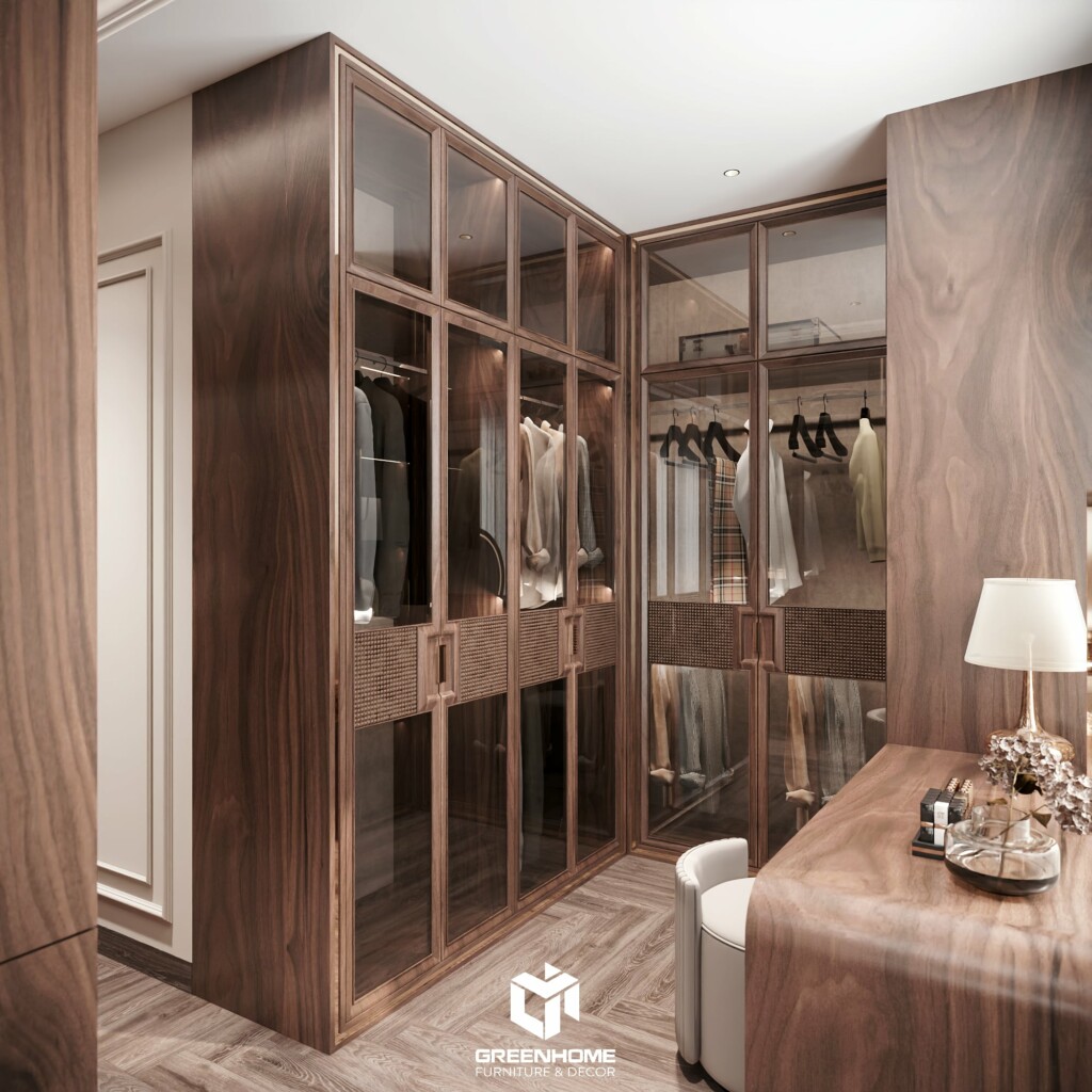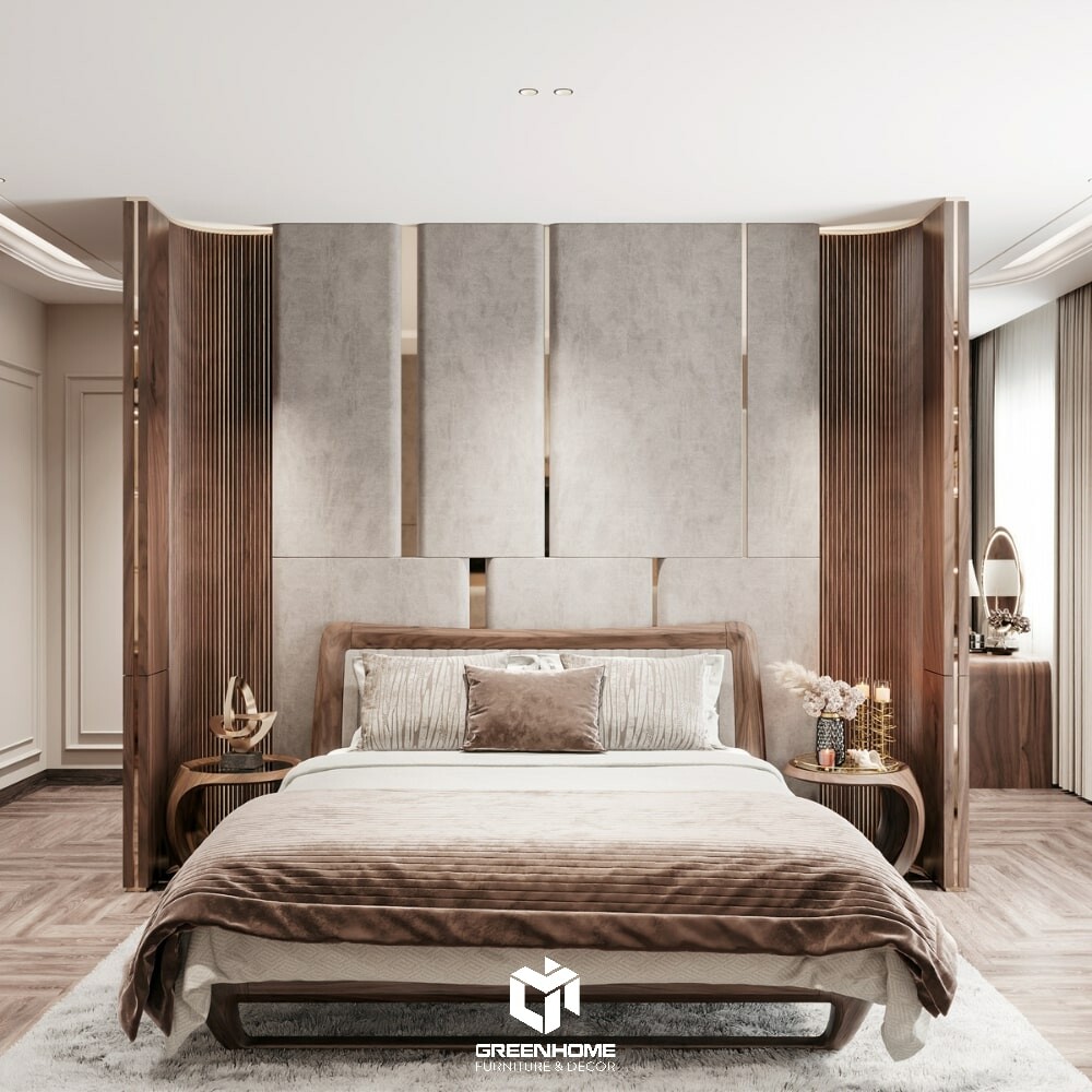 Phòng ngủ master mang vẻ đẹp hiện đại, sang trọng với tone nâu – kem hài hòa. Thiết kế đầu giường độc đáo kết hợp chất liệu nỉ và gỗ tạo điểm nhấn ấn tượng. Không gian phòng thay đồ được bố trí khoa học với hệ tủ gỗ kính cao cấp, sang trọng . Bàn trang điểm bo cong tinh tế, đậm chất nữ tính và tiện nghi cho gia chủ,tôn lên sự sang trọng cho tổng thể không gian.