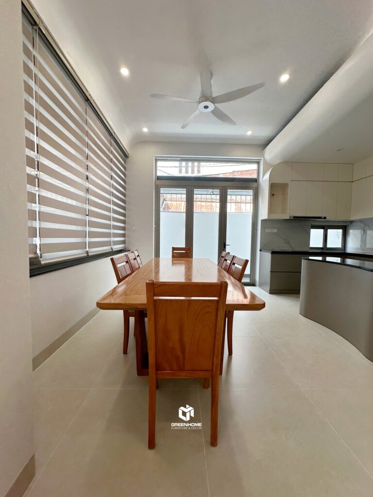Nội thất phòng bếp được thiết kế tinh tế. Là kết hợp giữa sự tối giản và hài hòa, tạo ra không gian mở và thoáng mát. Bàn ăn cùng các món nội thất được chế tác từ gỗ màu sáng, mang đến vẻ hiện đại nhưng vẫn giữ được sự ấm cúng và gần gũi cho gia đình.