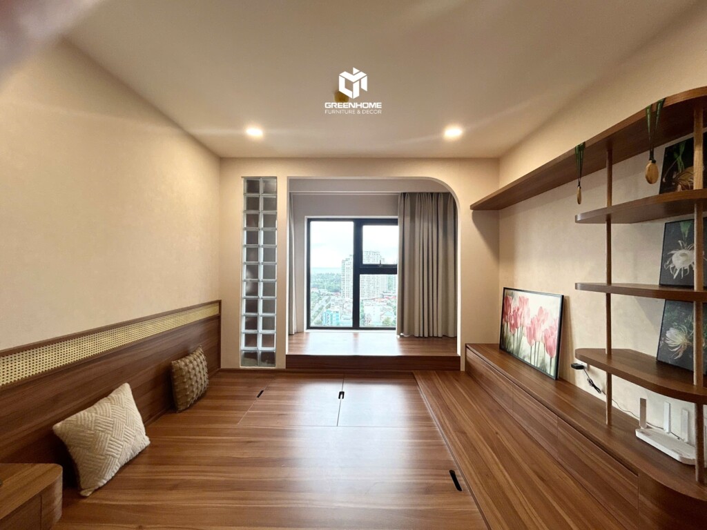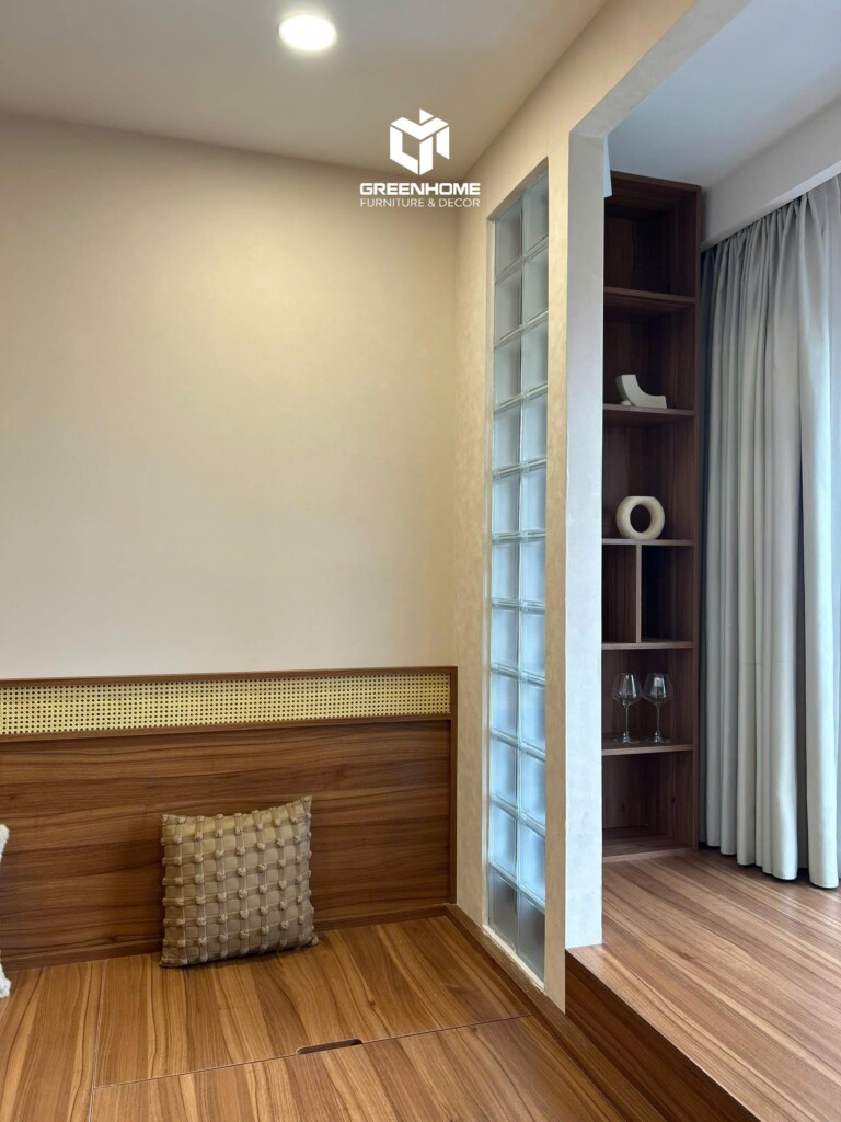 Không chỉ chú trọng thẩm mỹ, căn hộ còn được tính toán tỉ mỉ từng chi tiết để tối ưu công năng. Tủ kệ âm tường, hộc chứa ẩn dưới sàn, các góc nhỏ linh hoạt đều được khai thác triệt để, giúp căn hộ luôn gọn gàng và thoáng rộng nhưng vẫn giữ được sự ấm cúng.
