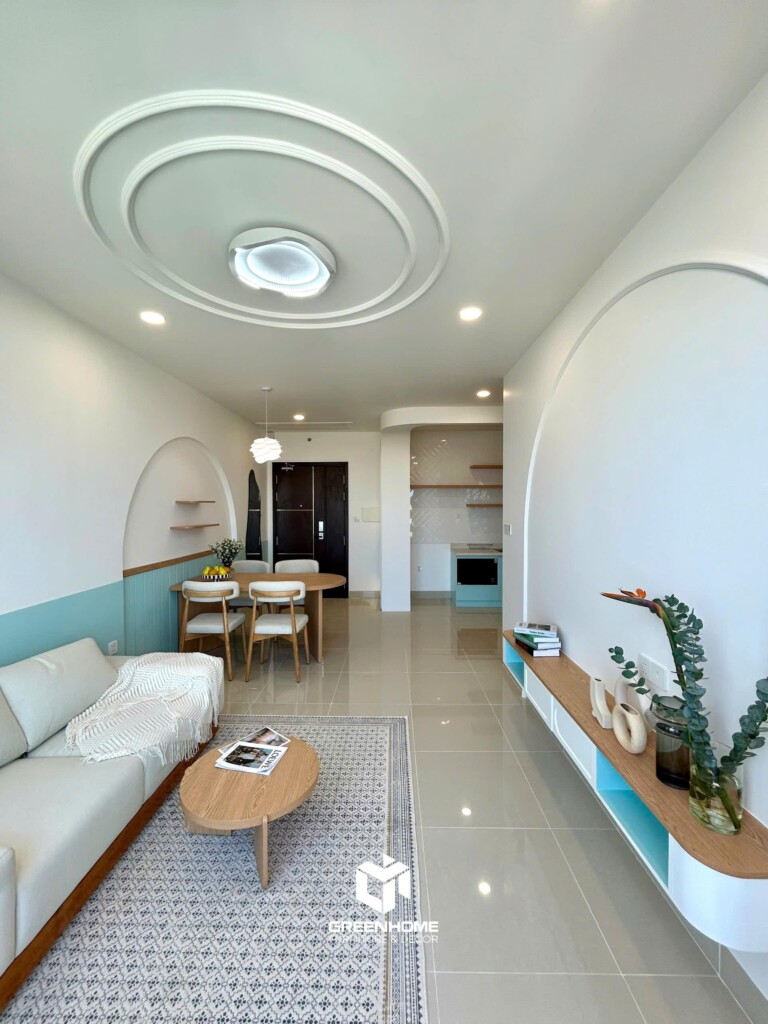 ✨ Chi tiết Wabi-sabi: Đèn thả trần tinh tế, mảng tường bo cong uyển chuyển, vật liệu gỗ An Cường, ánh sáng chan hòa từ ban công hướng biển.