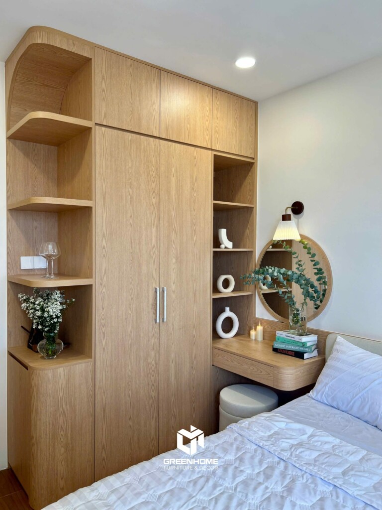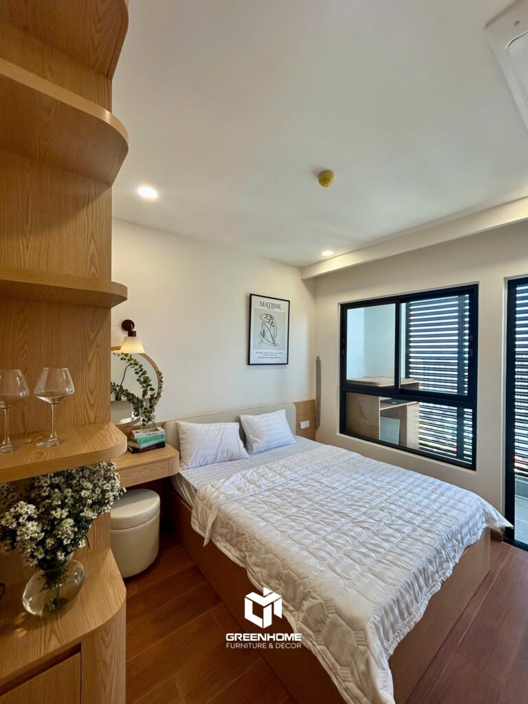 ✨ Phòng ngủ: Nội thất tối giản, đường cong mềm mại, vân gỗ tự nhiên tạo điểm nhấn.