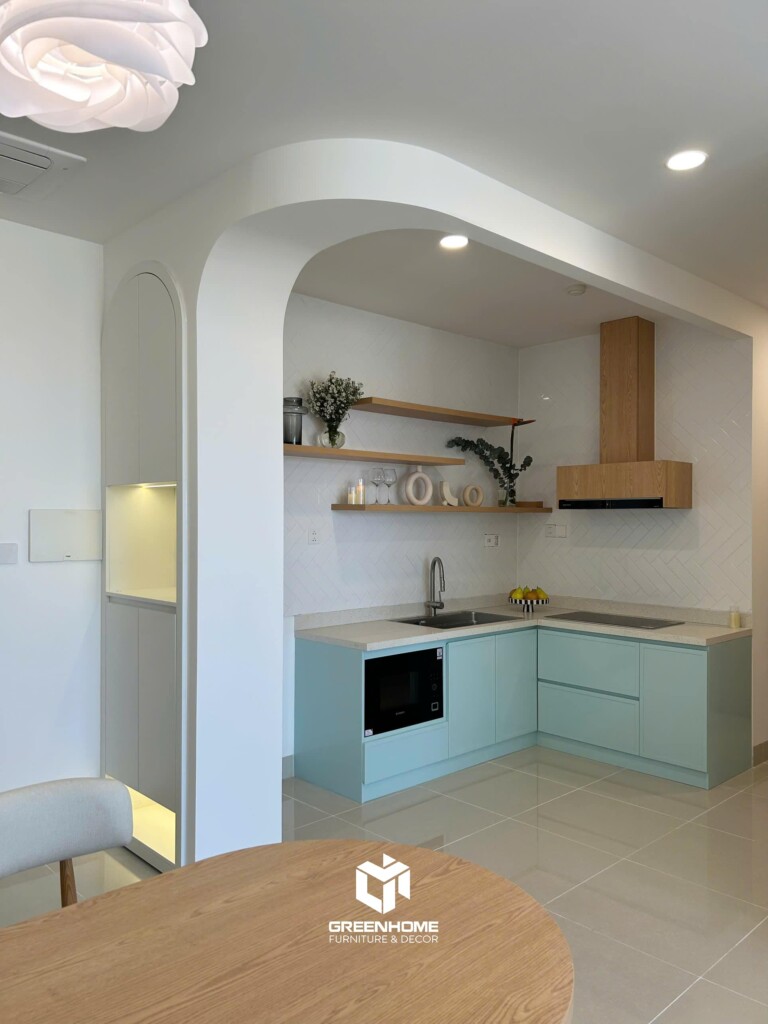 ✨ Phòng khách & bếp: Kết hợp tone trắng, gỗ ấm và xanh pastel, thiết kế mở liên thông giúp tối ưu ánh sáng và diện tích.