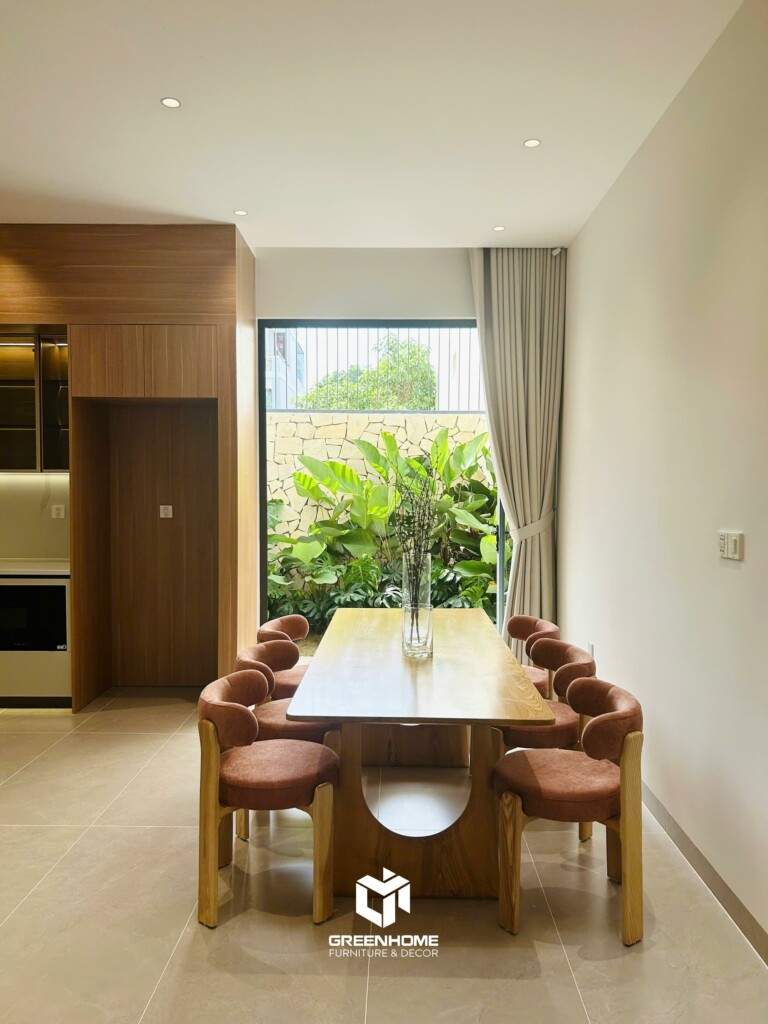 Bàn ăn đặt ngay cạnh ô cửa lớn nhìn ra sân vườn xanh mát, giúp ánh sáng tự nhiên lan tỏa khắp không gian. Bộ ghế bọc nỉ tông hồng đất nổi bật trên nền trung tính, mang lại sự ấm áp, gần gũi nhưng không kém phần sang trọng. Cách bố trí này tạo nên một khu vực dùng bữa lý tưởng – nơi các thành viên có thể gắn kết mỗi ngày trong không gian tinh tế và thoải mái