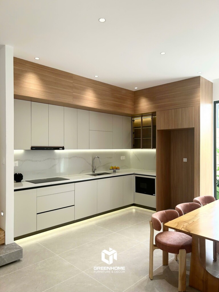 Khu vực bếp sử dụng thiết kế chữ L ôm gọn không gian, giúp tối ưu công năng mà vẫn đảm bảo sự thoáng đãng. Hệ tủ bếp đồng bộ chất liệu với nội thất tổng thể, phủ laminate vân gỗ An Cường, vừa bền đẹp vừa dễ lau chùi. Đá bếp vân trắng marble tạo điểm nhấn nhẹ nhàng, hiện đại.