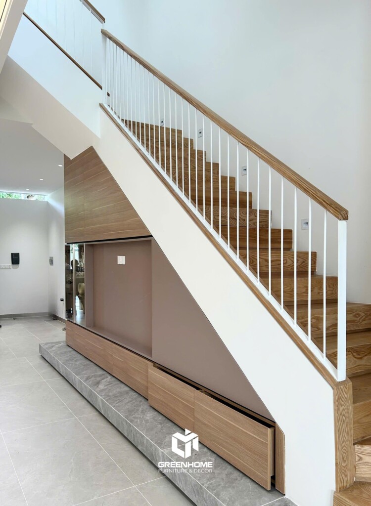 Tủ trang trí kết hợp kệ tivi được thiết kế âm tường tận dụng khoảng trống dưới cầu thang, vừa tiết kiệm diện tích vừa mang lại tính thẩm mỹ cao. Trần thạch cao giật cấp kết hợp đèn led âm trần giúp tăng chiều sâu cho không gian, đồng thời tạo hiệu ứng ánh sáng dịu nhẹ vào buổi tối. Vật liệu hoàn thiện chủ yếu là gỗ An Cường, mang lại sự đồng nhất, hiện đại và bền vững cho toàn bộ khu vực tiếp khách.