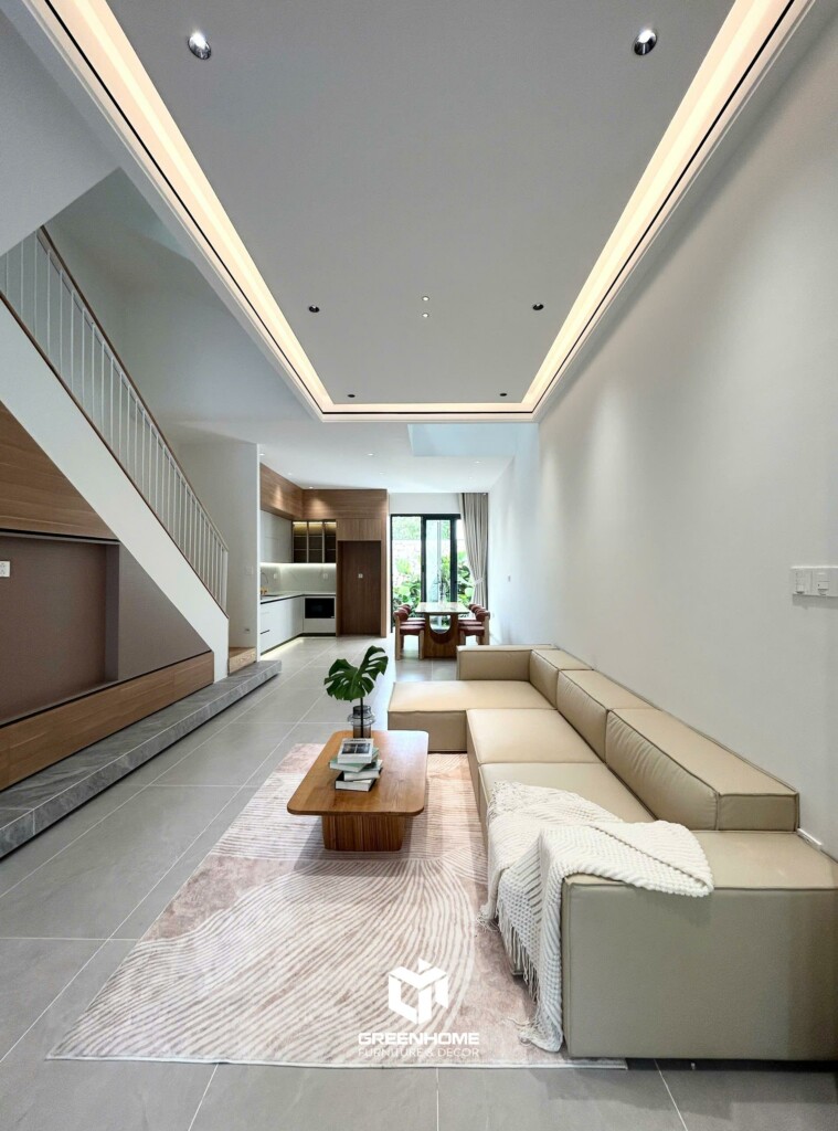Không gian phòng khách mang đậm phong cách hiện đại với thiết kế tối giản, tận dụng triệt để ánh sáng tự nhiên từ hệ cửa kính lớn hướng ra sân vườn. Bộ sofa chữ L bọc da màu kem tạo cảm giác ấm áp, thoải mái nhưng vẫn sang trọng.
