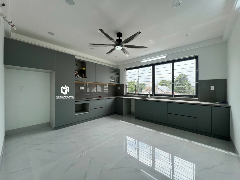 Căn bếp rộng rãi, thoáng đãng được tối ưu nguồn sáng tự nhiên với hệ cửa sổ đón nắng. Mang lại không khí trong lành, tạo cảm giác thoải mái khi nấu nướng. Tích hợp với đó là khu vực ăn uống gọn gàng, tiết kiệm diện tích nhưng vẫn đảm bảo công năng và tiện nghi.