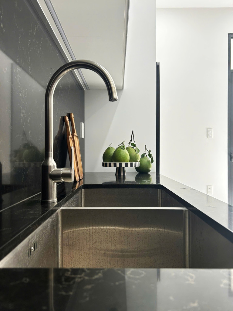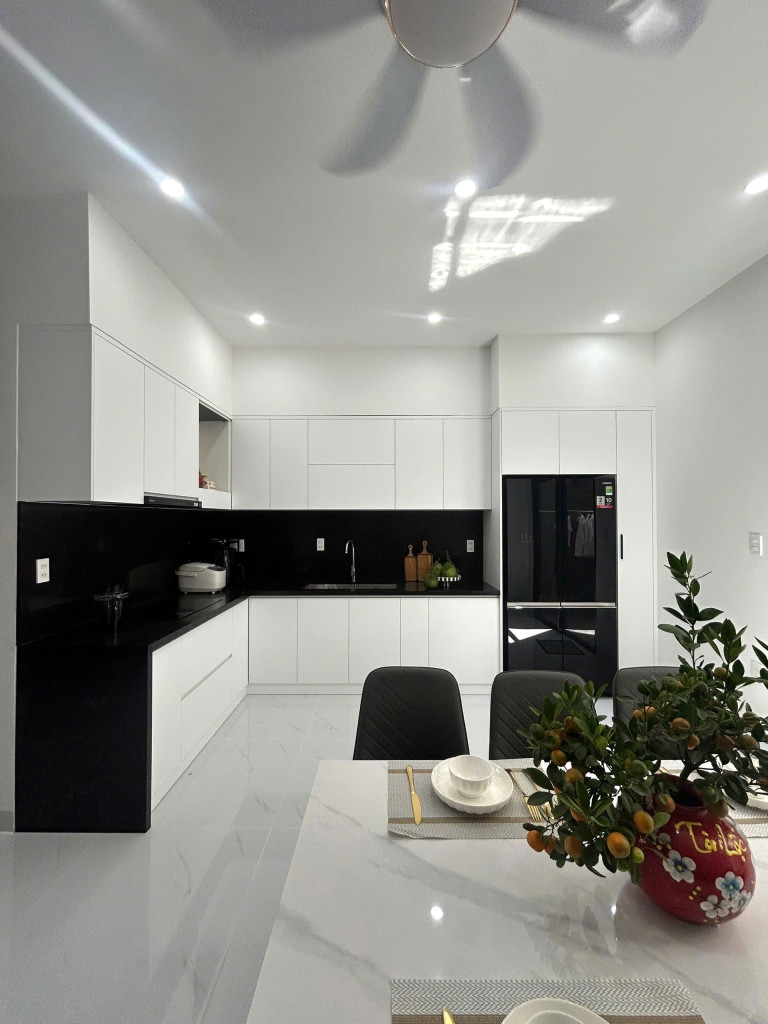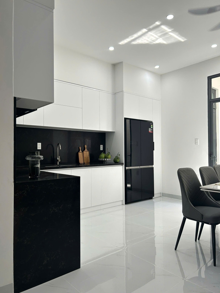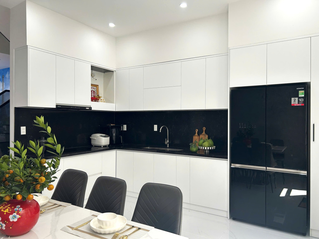 Gam màu hiện đại kết hợp đường nét phẳng giúp khu vực bếp trở nên sang trọng nhưng vẫn thân thiện trong quá trình sử dụng.