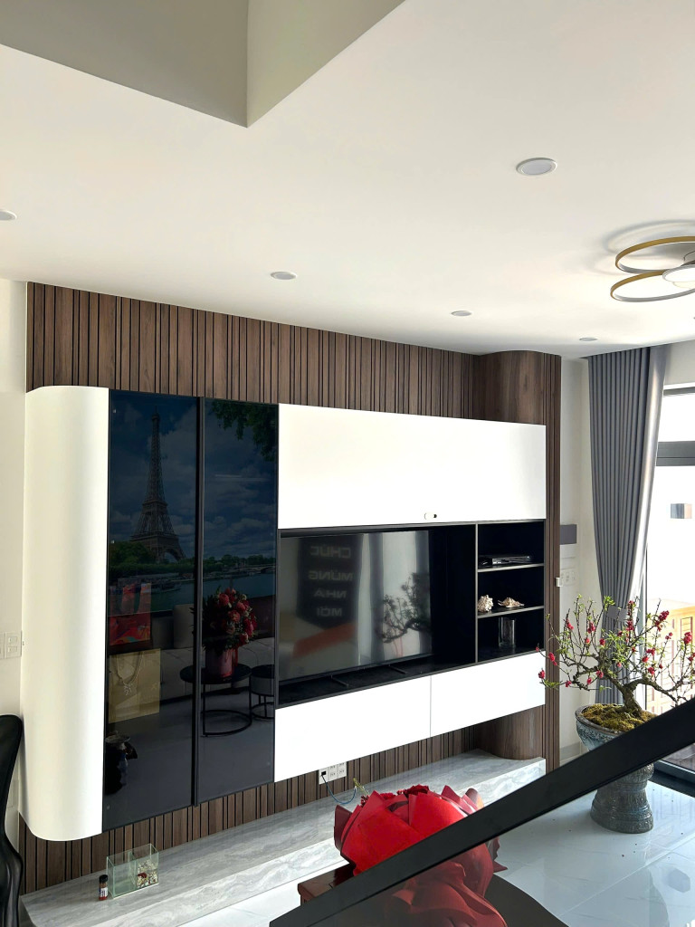 Khu vực phòng khách sử dụng tone màu trung tính kết hợp vật liệu gỗ An Cường, tạo nên tổng thể nhẹ nhàng và hiện đại.