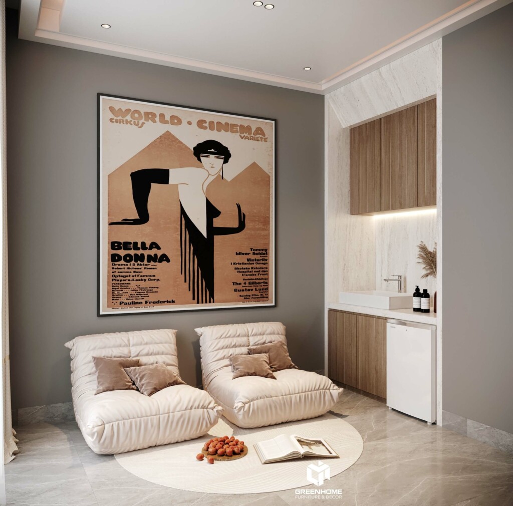 Phòng chơi game là không gian giải trí dành cho mọi thành viên trong gia đình. Mặc dù diện tích nhỏ gọn nhưng căn phòng vẫn được trang bị đầy đủ tiện nghi. Bên trong, có một quầy bếp nhỏ với tủ lạnh mini, đảm bảo các thành viên có thể thoải mái sinh hoạt trong phòng suốt thời gian dài mà không lo cảm giác ngột ngạt hay bất tiện. Đây thực sự là nơi lý tưởng để cả gia đình thư giãn và tận hưởng những giờ phút vui vẻ bên nhau.