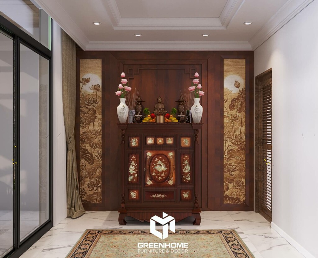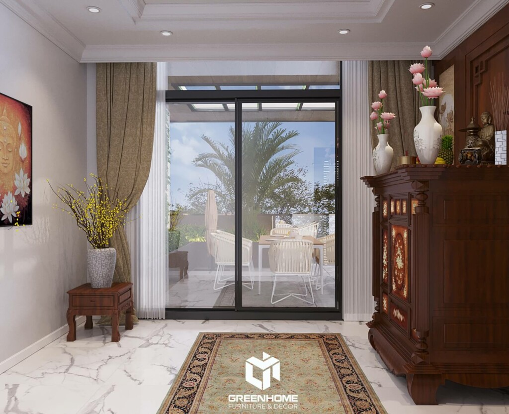 Tầng thượng gồm phòng thờ gia tiên và khu vực sinh hoạt ngoài trời. Hệ lam vẫn được ứng dụng ở khu vực này để tạo nên thống nhất về nội thất cho ngôi nhà và cũng để điều hòa nhiệt độ cho phòng thờ mát mẻ hơn.