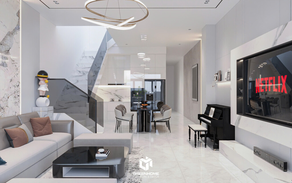 Phòng khách hiện đại, tối giản nhưng sang trọng nhờ việc sử dụng gam màu trung tính như trắng, xám và đen, kết hợp cùng các vật liệu cao cấp như đá marble, kim loại và kính. Bên cạnh đó, TV được bố trí âm tường cùng hệ kệ trang trí tinh gọn, giúp tối ưu diện tích sử dụng.