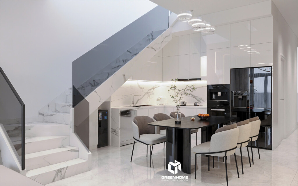 Căn bếp nối liền phía sau, được cầu thang tinh tế che đi một góc tạo sự riêng tư nhưng vẫn đảm bảo tính kết nối với không gian chung. Thiết kế mở giúp ánh sáng tự nhiên lan tỏa khắp khu vực, kết hợp cùng vật liệu hiện đại và tông màu trung tính mang lại cảm giác ấm cúng cho không gian nấu nướng.