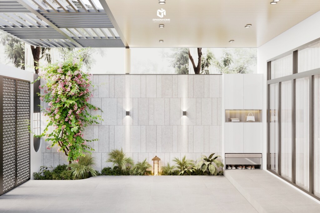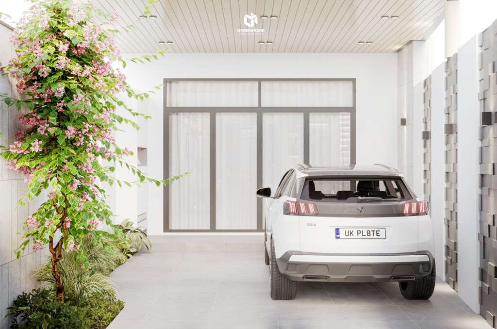 Khu vực phía trước nhà được tận dụng làm khoảng trống trồng cây và để xe. Không gian mở được tận dụng tối đa, giúp đón ánh sáng tự nhiên và gió, tạo cảm giác thoáng đãng. Những đường nét mềm mại, vật liệu thân thiện môi trường và cây xanh trong nhà góp phần mang đến sự hài hòa giữa hiện đại và thiên nhiên.
