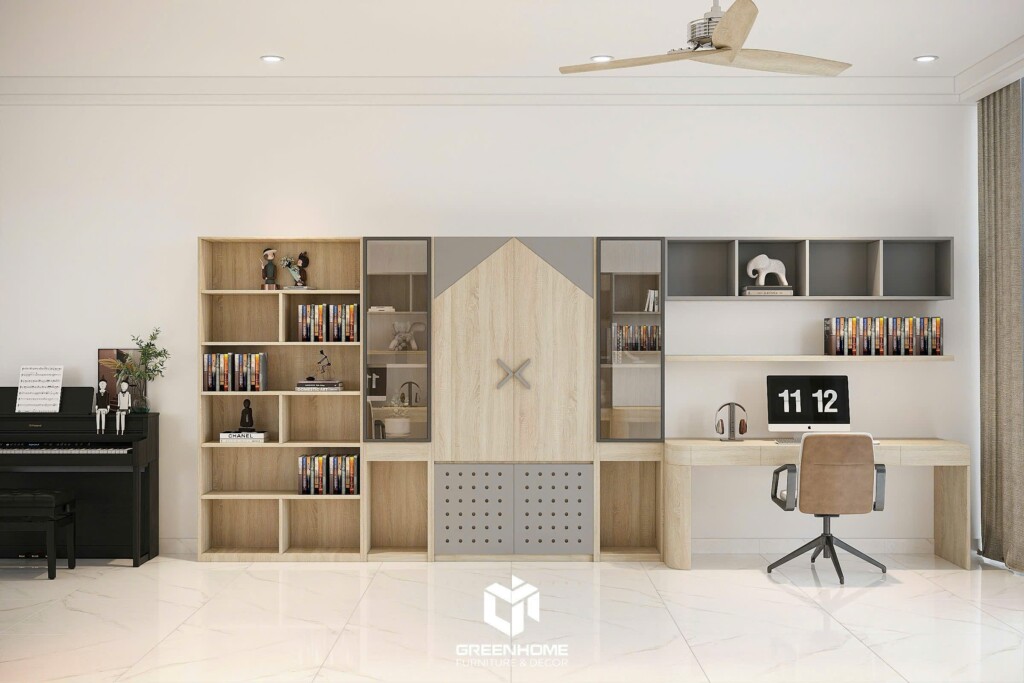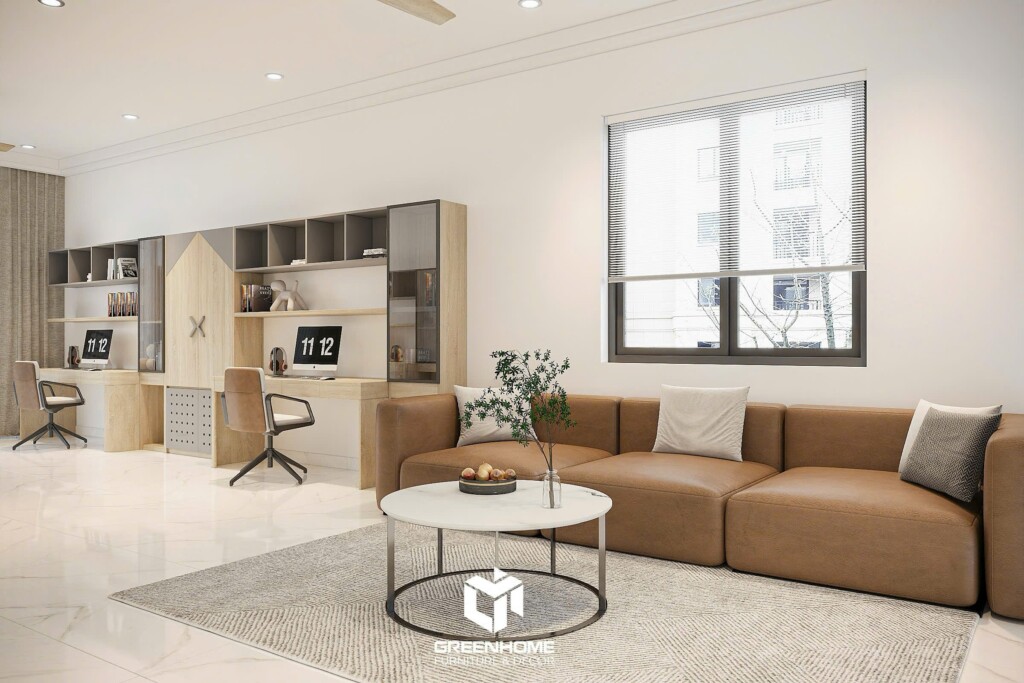 Không gian phòng khách rộng mở, kết hợp hài hòa với khu vực làm việc và học tập, tạo nên một không gian đa năng và tiện lợi. Tổ hợp này biến phòng khách không chỉ là nơi nghỉ ngơi, thư giãn mà còn trở thành góc học tập, làm việc hiệu quả. Sự kết hợp thông minh giữa các chức năng khác nhau giúp tối ưu hóa diện tích, mang lại cảm giác thoải mái và tăng cường khả năng sáng tạo trong công việc và học tập.