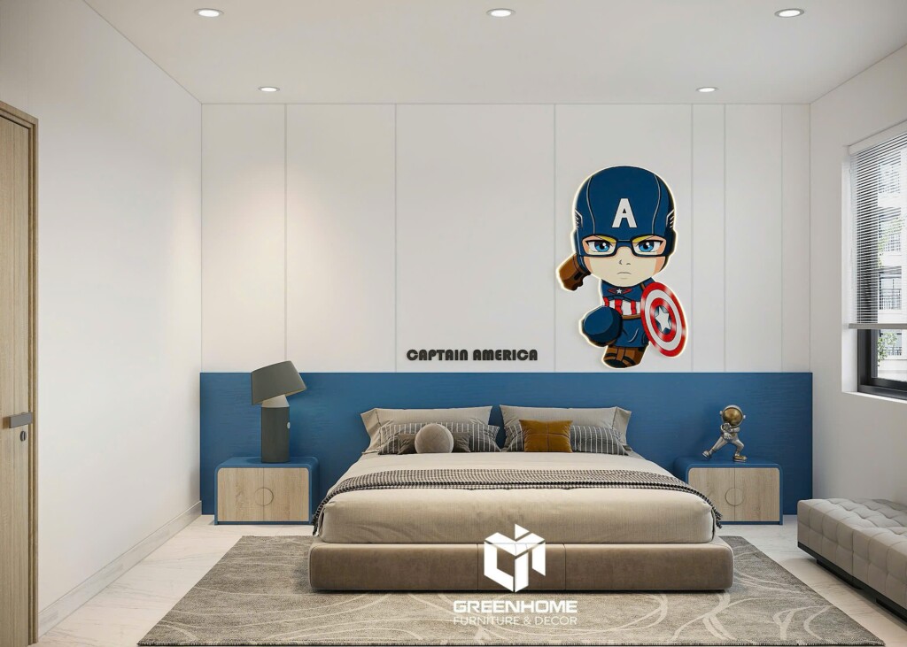 Căn phòng ngủ tiếp theo dành cho 2 bé với những đường nét tinh tế, bố trí cùng với họa tiết hợp độ tuổi của trẻ. GreenHome các bé sẽ được lớn lên một cách lành mạnh trong môi trường này.