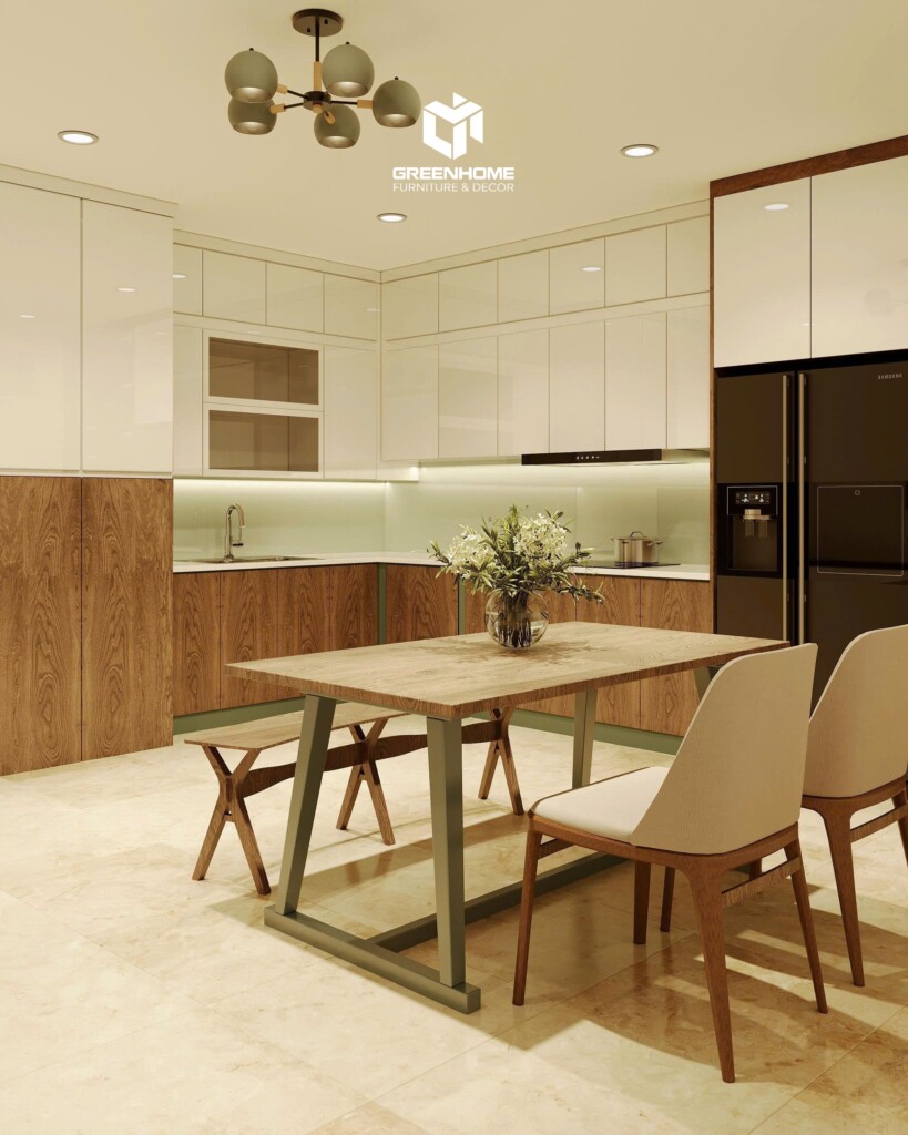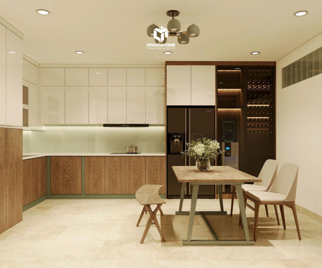 Khu vực bếp – ăn liền kề được bố trí gọn gàng, thông minh. Hệ tủ bếp chữ L kết hợp giữa chất liệu gỗ và acrylic bóng gương, vừa tạo cảm giác rộng rãi, vừa dễ dàng vệ sinh. Bàn ăn gỗ tự nhiên được đặt cạnh tủ rượu sang trọng, mang đến sự tiện lợi cho những bữa cơm ấm cúng, cũng như những buổi tiệc nhỏ tại gia.