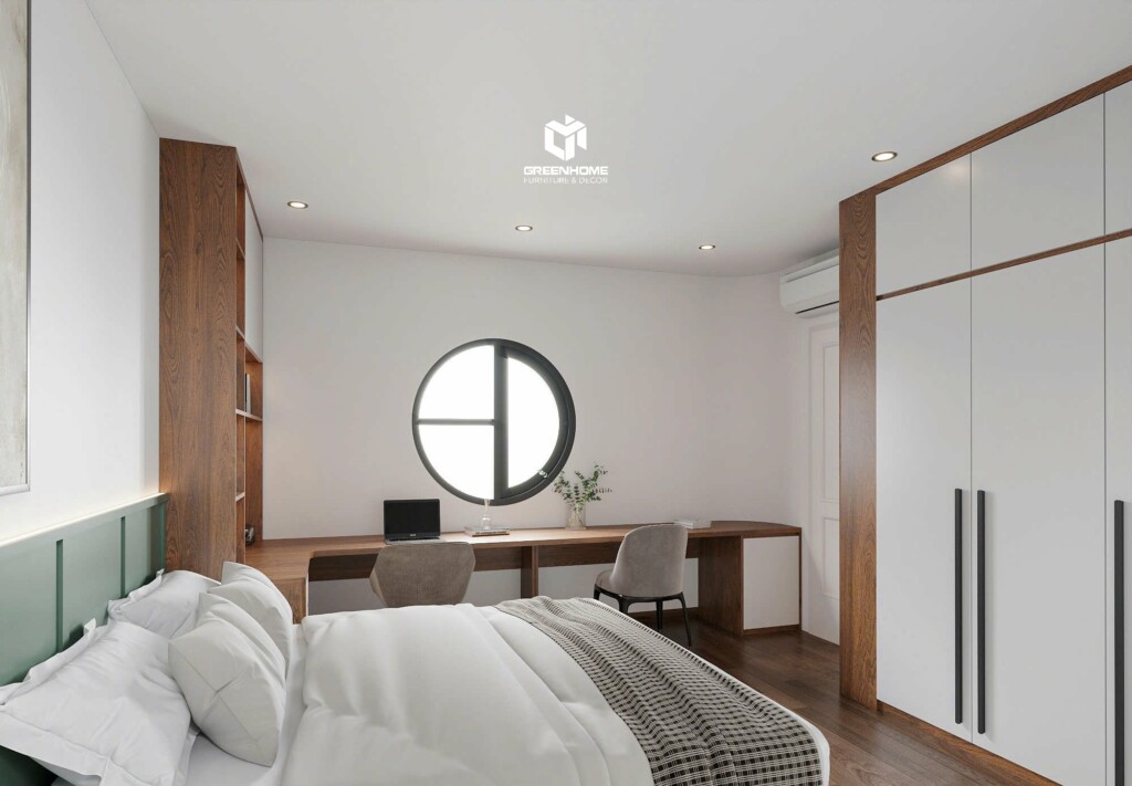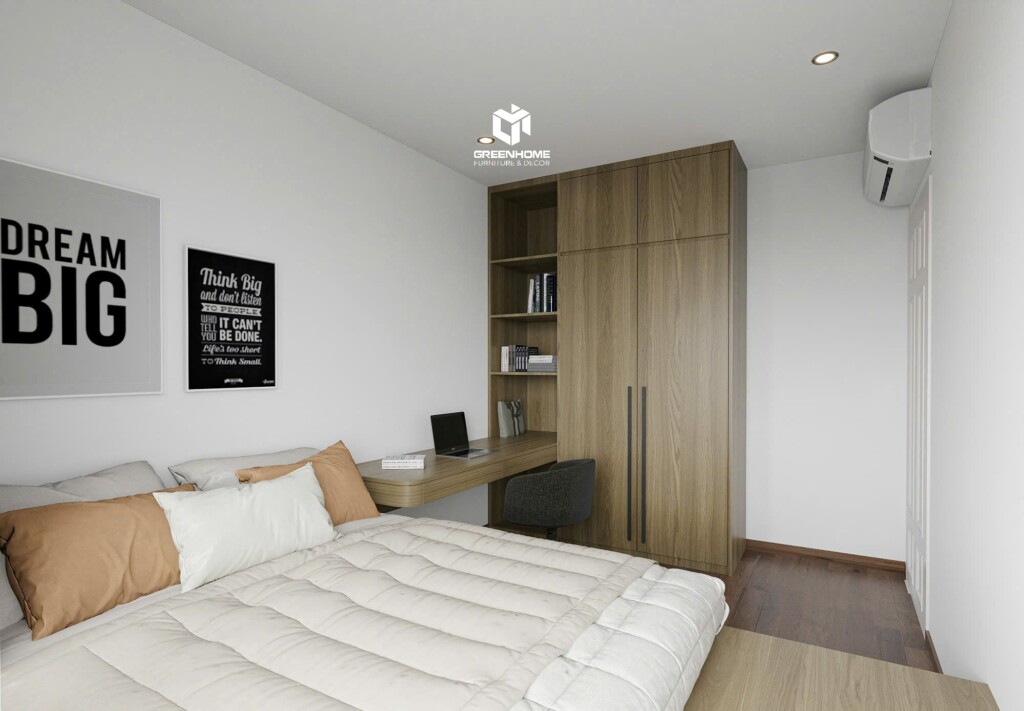 Phòng ngủ đầu tiên được thiết kế theo phong cách tối giản, với gam màu ấm áp từ gỗ sồi kết hợp màu trắng tinh khôi. Nội thất tích hợp thông minh gồm tủ quần áo liền bàn học – bàn làm việc, tối ưu hóa diện tích sử dụng. Đây là không gian lý tưởng cho gia chủ vừa nghỉ ngơi, vừa tập trung học tập hoặc làm việc hiệu quả.