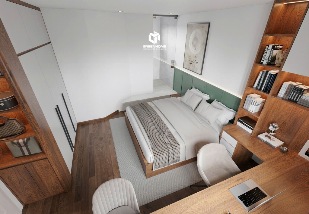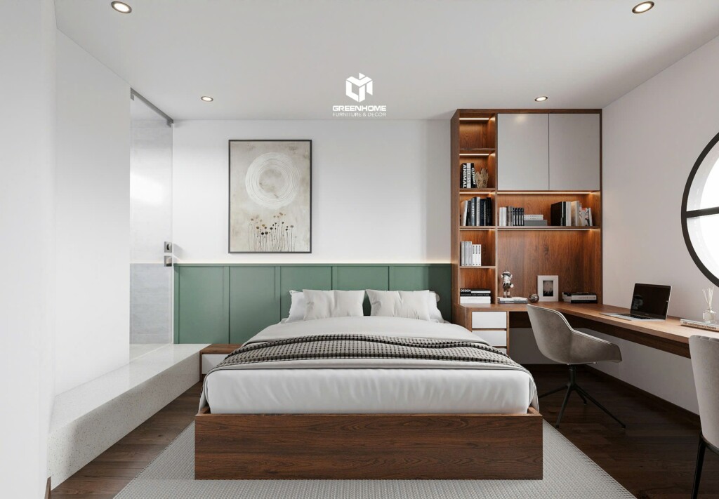 Phòng ngủ thứ hai nổi bật với điểm nhấn ốp tường màu xanh pastel kết hợp cùng gỗ óc chó sang trọng. Kệ sách và bàn làm việc được bố trí khoa học, có hệ đèn led hắt sáng tạo sự ấm áp và sang trọng. Không gian này phù hợp cho những ai yêu thích sự yên tĩnh, sáng tạo và mong muốn có một căn phòng mang đậm dấu ấn cá nhân.