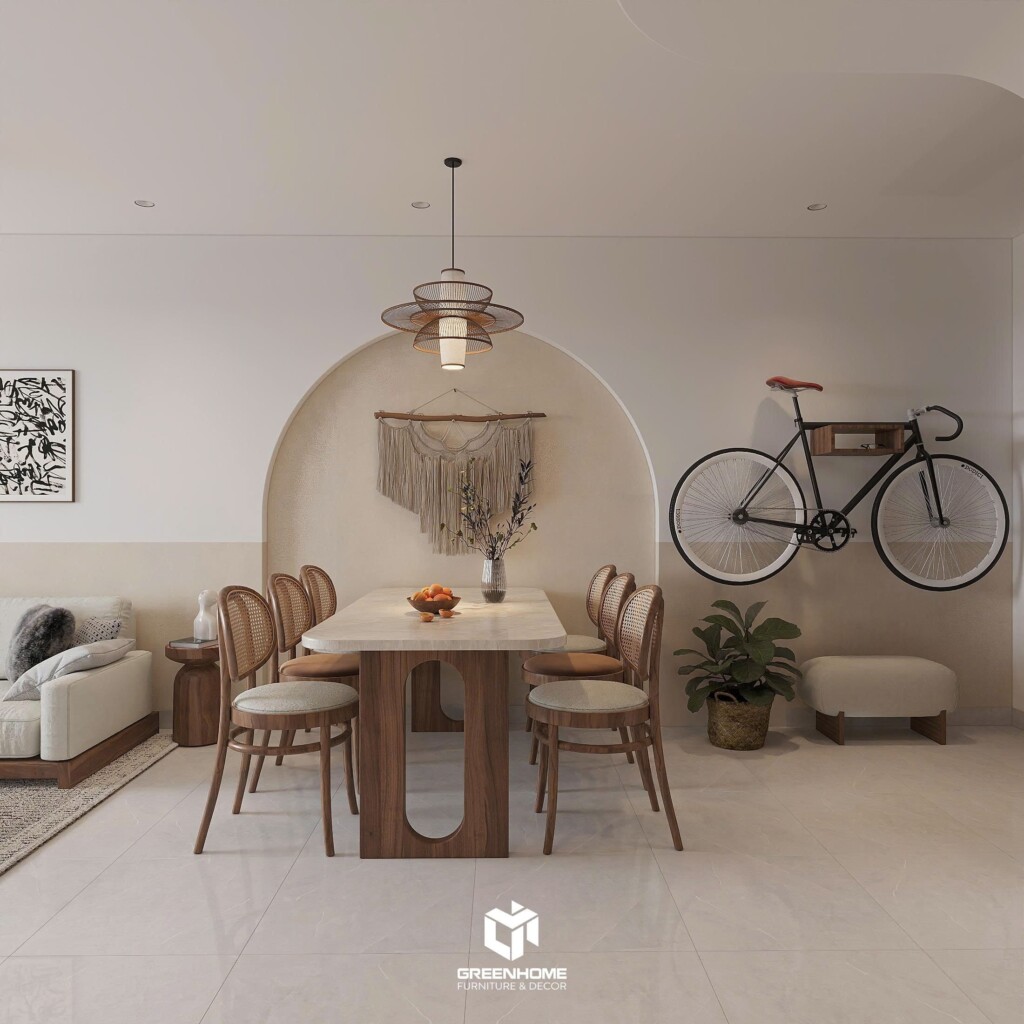 Tông màu trắng - be kết hợp cùng gỗ An Cường tạo cảm giác ấm áp nhưng vẫn hiện đại. Điểm nhấn là các chi tiết mây tre đan ở đôn ngồi, đèn trần hay vách ngăn, mang lại chất "tropical" nhẹ nhàng mà khác biệt.