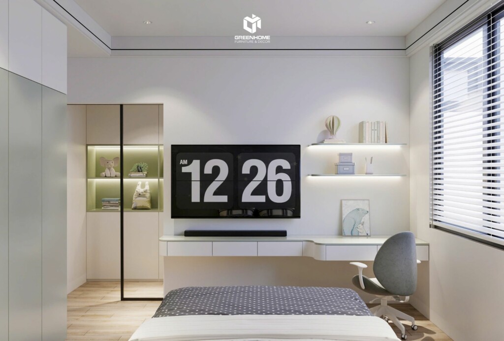 Phòng ngủ trẻ con có nội thất với họa tiết đáng yêu đúng với độ tuổi của bé. Các đường nét cũng được tối giản để tạo môi trường an toàn cho trẻ. Màu xanh lá cũng được sử dụng để mang lại cảm giác tươi mới, gần gũi với thiên nhiên, đồng thời tạo ra một không gian yên bình và thư giãn cho bé. Màu xanh lá còn được biết đến là một màu sắc giúp trẻ cảm thấy thoải mái và phát triển một cách tự nhiên. Đồng thời, đây cũng là màu sắc mà bé yêu thích.