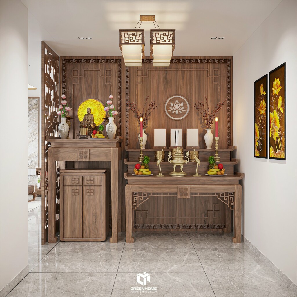 Không gian thờ tự với hai bàn thờ, một bàn thờ Phật và một bàn thờ lớn hơn thờ gia tiên, được thiết kế trang trọng và tôn nghiêm. Tổng thể phòng thờ có màu sắc trầm ấm, tạo nên không gian yên bình và thanh tịnh.