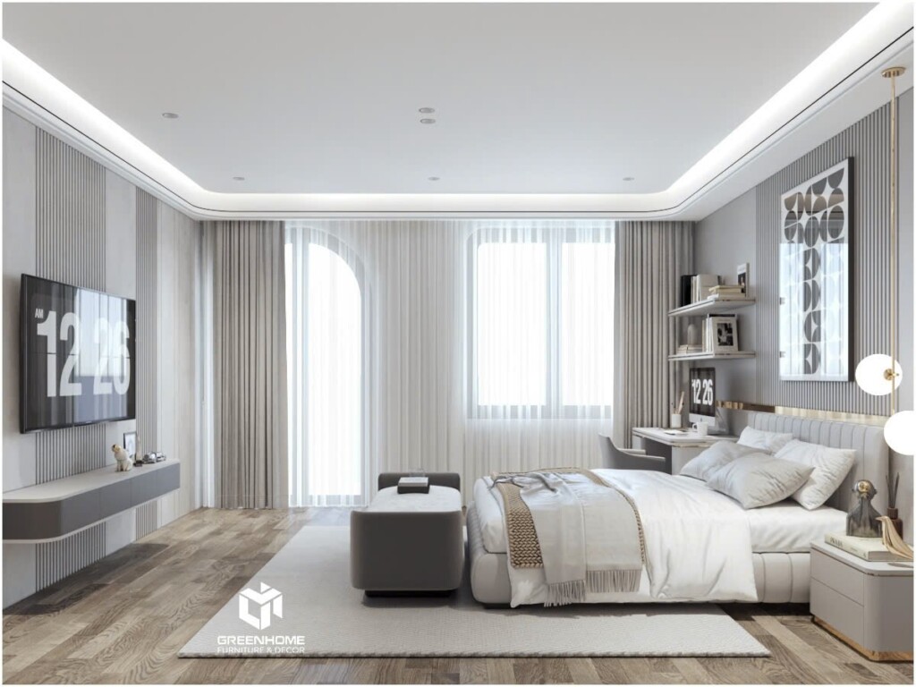 Tuy đơn giản hơn so với nội thất phòng ngủ master nhưng nội thất phòng ngủ thường không hề đơn điệu. Phòng ngủ làm theo phong cách monochrome hiện đại với tông màu xám và trắng tạo nên không gian thanh lịch và sang trọng. Sàn gỗ xám nhạt trải dài, mang đến sự ấm áp và đồng bộ với tông màu tổng thể. Trần nhà phẳng, kết hợp đèn âm trần tinh tế, mang đến không gian mở rộng rãi và hiện đại, toát lên sự tối giản và trang nhã cho thiết kế nội thất cao cấp.