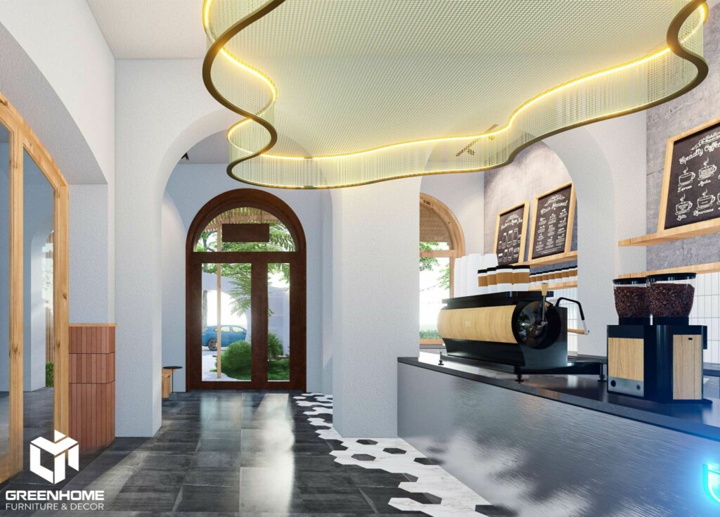 Không gian bên trong quán sử dụng chủ yếu gam màu trắng xám, lấy điểm xanh của cây xanh và đèn làm điểm nổi bật. Quầy order thiết kế dài và rộng rãi thuận tiện cho việc pha chế và trả đơn cho khách. Ánh đèn vàng len lỏi làm điểm nhấn để không gian trở nên ấm cúng và đặc sắc hơn.