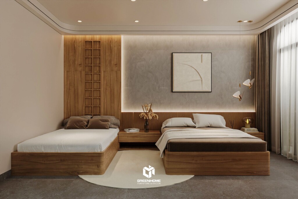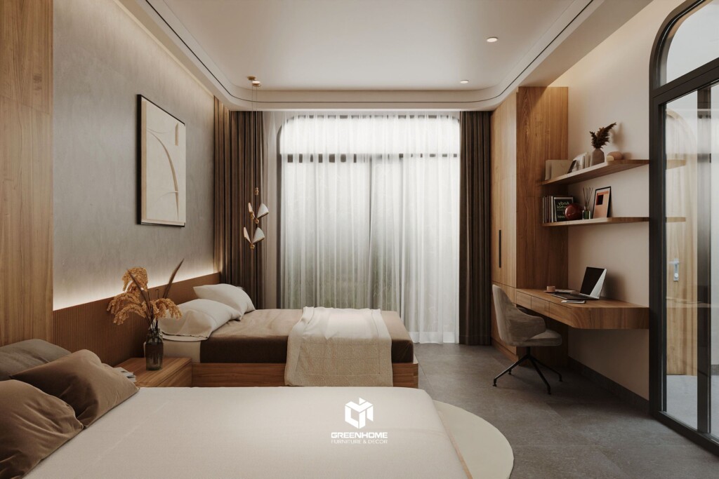 Hai chiếc giường được bố trí song song, hướng ra cửa kính lớn giúp đón sáng tự nhiên. Bàn làm việc gắn tường gọn gàng giúp tiết kiệm không gian, trong khi chất liệu gỗ và ánh sáng dịu nhẹ giữ cho không gian luôn yên tĩnh, thư thái – đúng tinh thần của một phòng ngủ tối giản.
