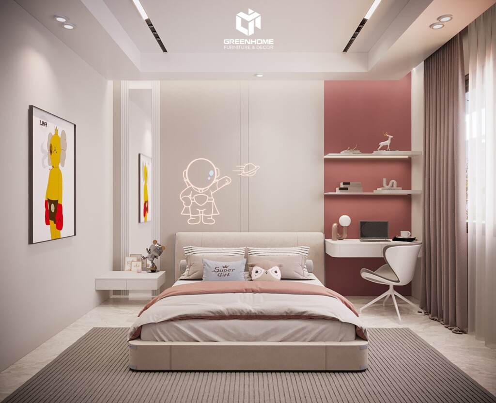 hòng ngủ thường với gam màu xám nhạt chủ đạo được thiết kế riêng biệt cho từng thành viên. Phòng phối màu hồng dành cho con gái, với giường phủ chăn ga hồng, kèm theo các họa tiết trang trí trên tường dễ thương và rèm cửa màu hồng phấn tạo nên không gian ngọt ngào và tươi vui.