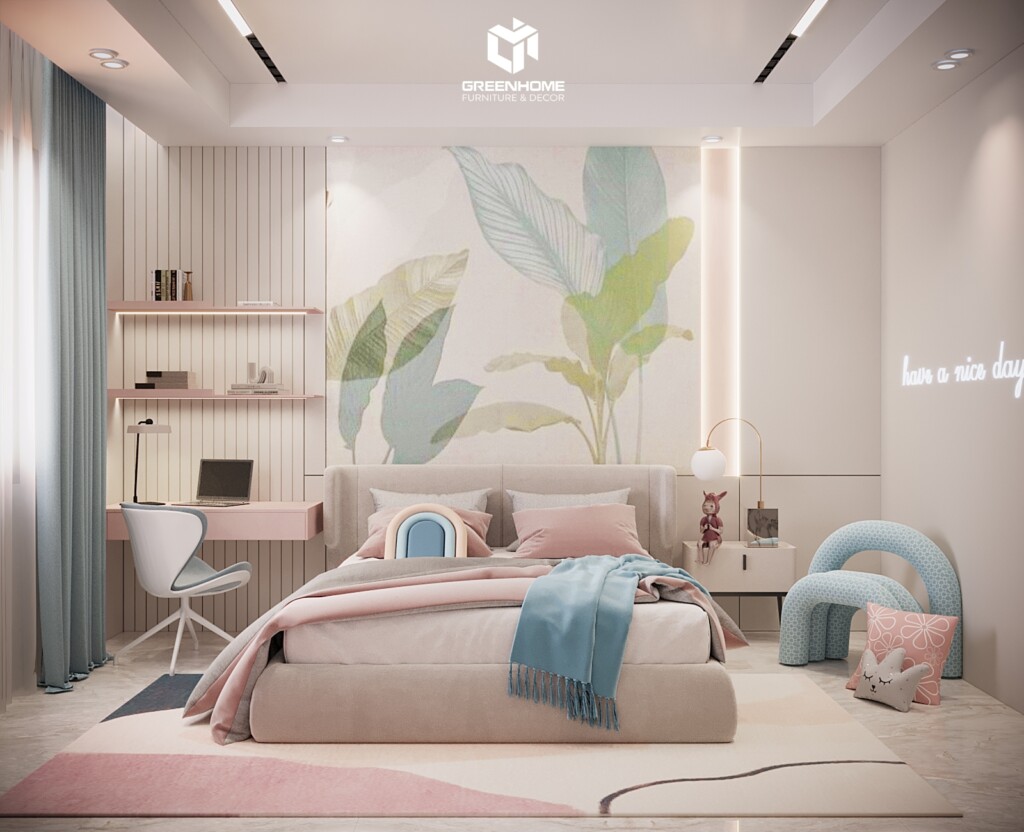 Căn phòng ngủ còn lại phối màu cây lá mang phong cách thiên nhiên, với bức tường trang trí hình lá cây xanh mướt. Ngoài ra, các màu bổ trợ như hồng và xanh dương giúp tạo điểm nhấn, mang đến cảm giác hài hòa và gần gũi với thiên nhiên.