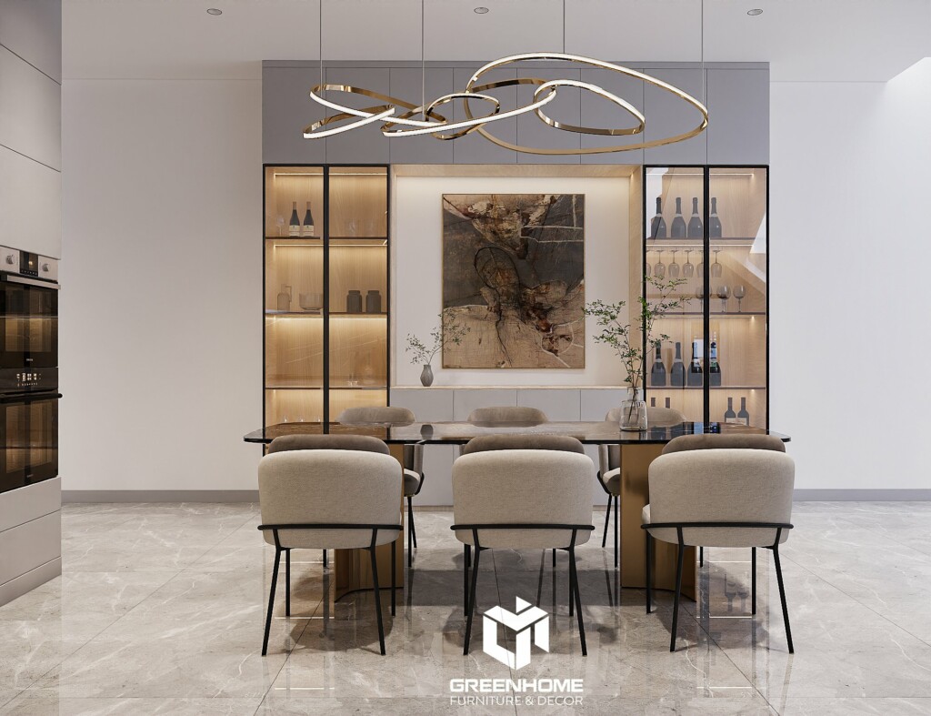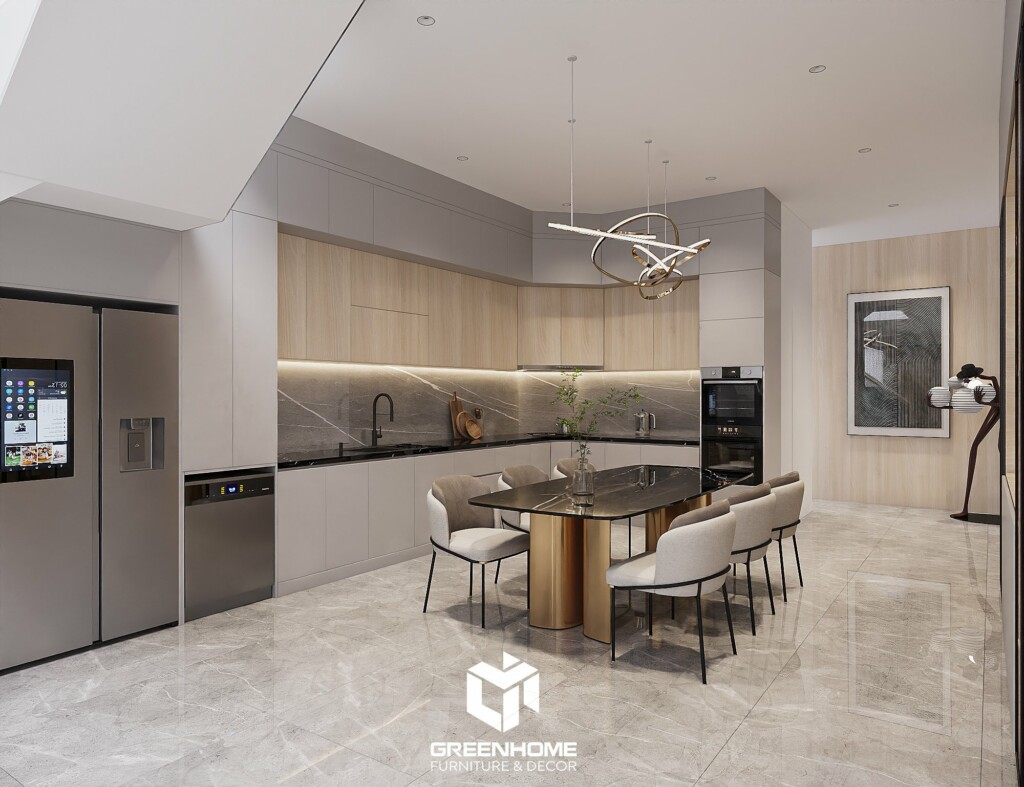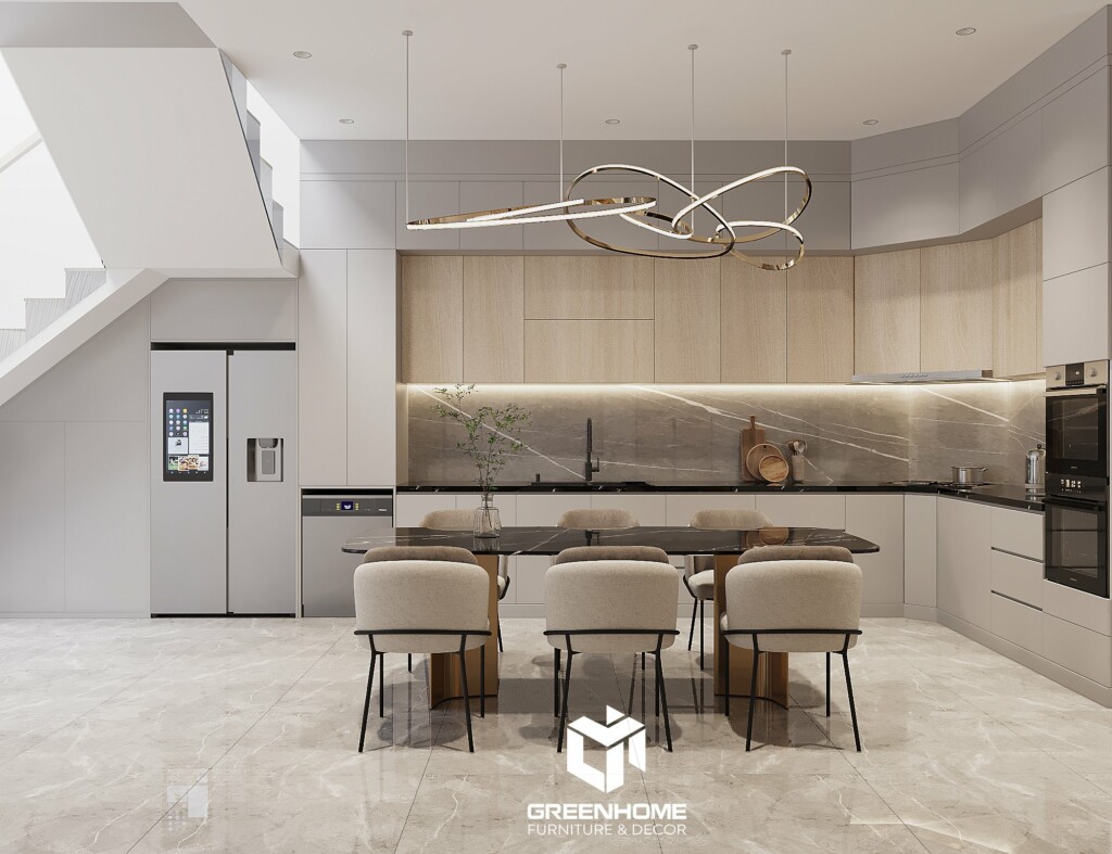 Phía sau phòng khách là phòng bếp, được ngăn cách bằng bể cá và cầu thang. Kiểu dáng bếp chữ L với hệ tủ kịch trần giúp tối ưu không gian lưu trữ và tạo cảm giác thông thoáng. Chính giữa là khu vực ăn uống với phần đèn sang trọng phía trên tạo điểm nhấn cho toàn bộ căn bếp. Đằng sau là tủ rượu và chứa đồ với nhiều ngăn được phân chia hợp lý, đảm bảo cả về mặt công năng và thẩm mỹ.
