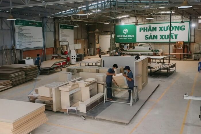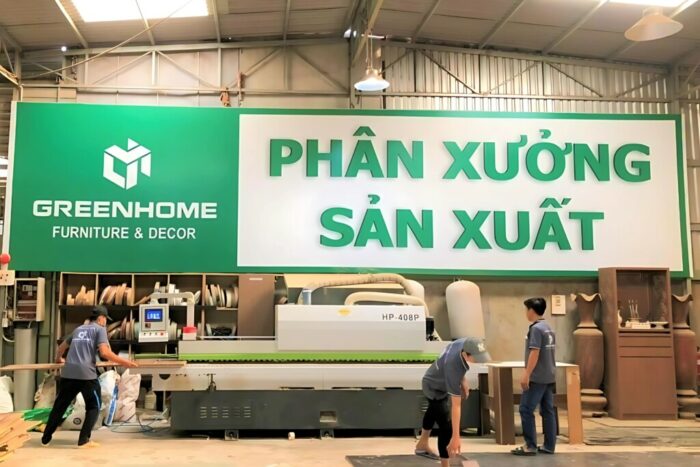 GreenHome sở hữu nhà xưởng sản xuất nội thất quy mô gần 1.000m², trang bị máy móc hiện đại như máy CNC trung tâm, máy dán cạnh tự động, cưa bàn trượt, hệ thống sơn hoàn thiện chuyên dụng.